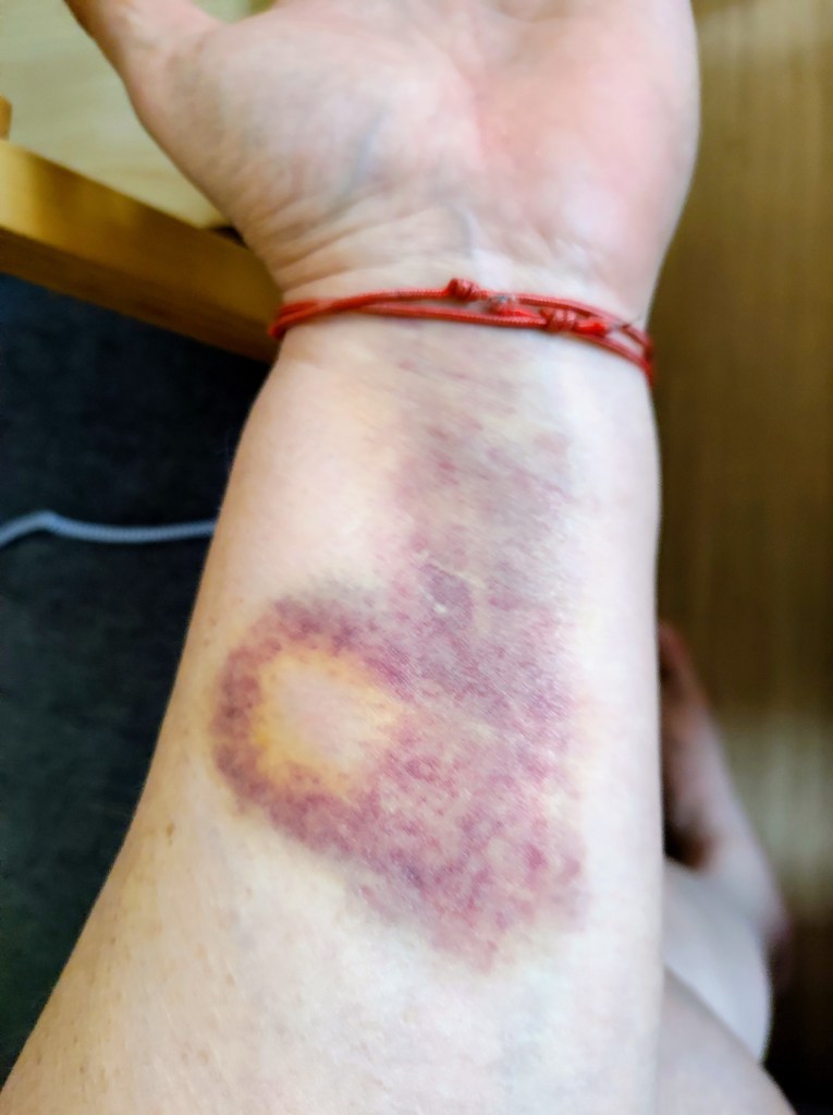 I mandags havde jeg fået taget blodprøver til nefrologisk eftersyn på torsdag. Det var fint, så kunne denne dags lægevikar nemlig med det samme konkludere, at hun vidste ikke hvorfor de blå mærker opstod, men hun kunne udelukke, at jeg havde leukæmi.