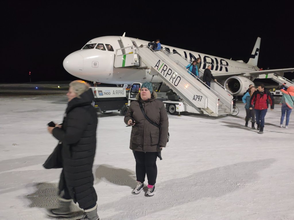 I Helsinki var vi nær kommet forsent til flyet til Kittila. Men falckdamen fandt en vogn og så ræsede vi igennem den 1,5 km lange lufthavn. Vi nåede flyet, og vi nåede at sidde og vente på de andre passagerer der havde taget den samme tur igennem lufthavnen, på gåben.